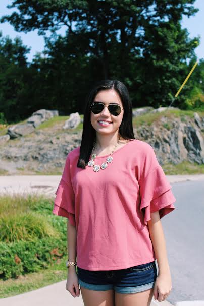 September is more than halfway over, yet it still feels exactly like summer with the weather I’ve been experiencing lately. Despite the heat, I am trying my hardest to put away the summer clothes (as sad as this is) and transition over to fall outfits. Last week, I modeled for my good friend Liz’s photography project in this adorable rose colored top from Marshall’s, which is my first attempt at putting my summer pinks to rest. I love flutter sleeve tops and it makes a great transition piece of clothing for the different seasons. As always, my necklace is from J.Crew, my shorts are from Hollister, my watch is from Kate Spade and my shoes are from Tory Burch.